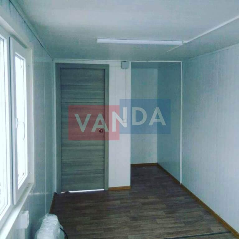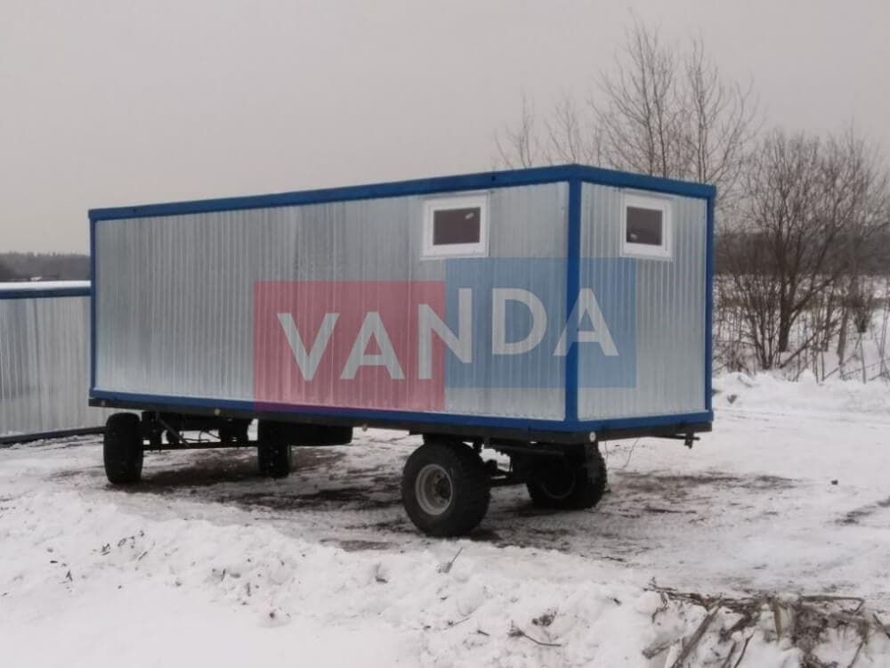 Контейнер на колесах состоит из металлического каркаса, который выполнен из профиля и укреплен сварным швом. Крыша покрыта листовым холоднокатанным окрашенным сварным металлом. Внешняя сторона стен обшита оцинкованным профнастилом. Внутренний каркас вагончика изготовлен из бруса. По всему периметру помещение утеплено и пароизолировано. Внутренняя отделка осуществляется по выбору заказчика. Это может быть вагонка или оргалитовые листы. Пол вагончика состоит из обрезной доски, пароизоляции, утепления поверх которого уложены ДСП. Вагончик оборудован дверью из оргалита и деревянными окнами с двойным остеклением.